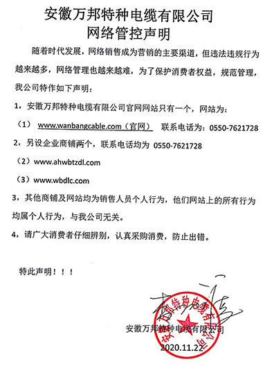 鄭重聲明:安徽萬邦特種電纜有限公司官方網站為:www_wanbangcable_com.lnfcc.cn,除此之外無任何子網站或合作網站,其余均為假冒偽劣。電話:0550-7621728 13485756353 地 址:安徽省天長市滁州高新技術產業開發區經四路29號